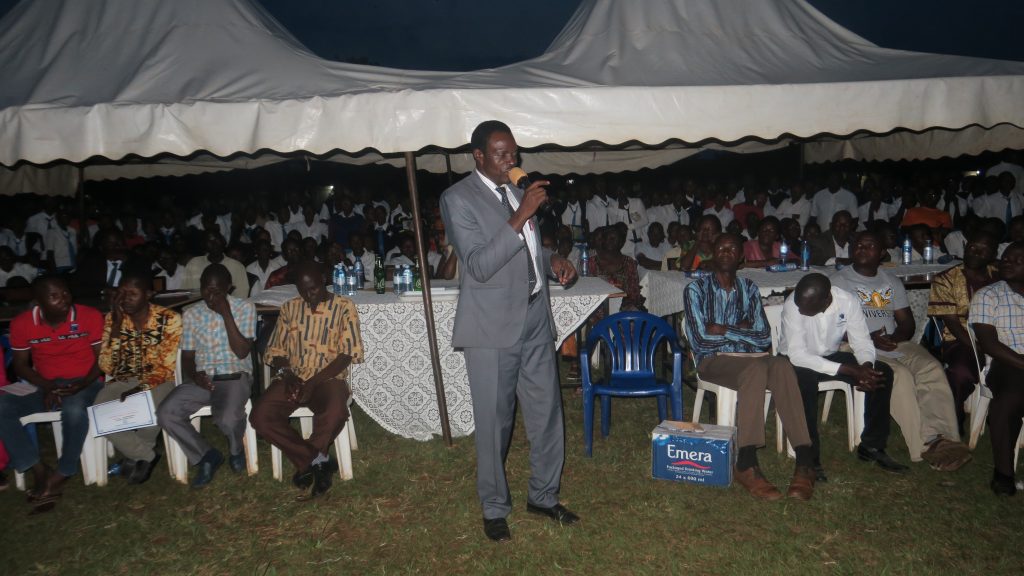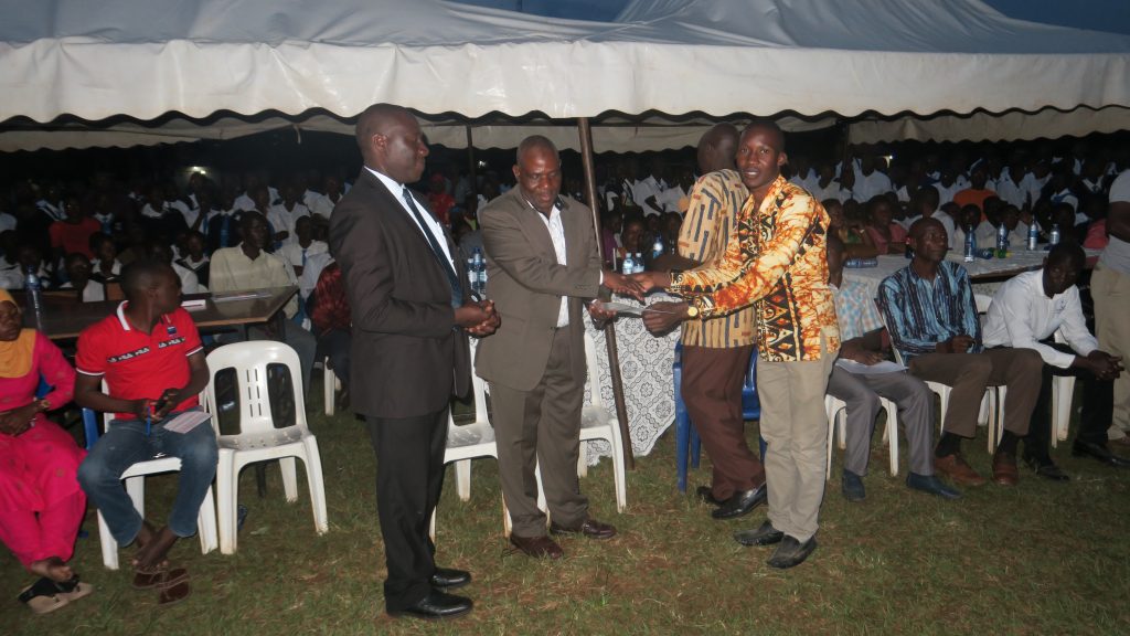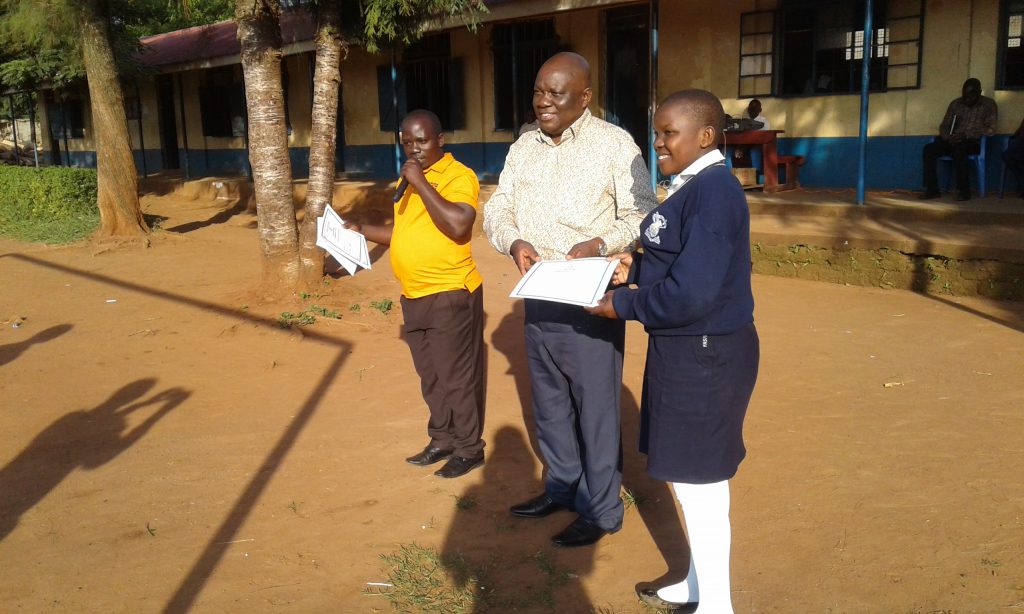 HM Mr.Waiswa Ben giving certificates to best performers in MDD at assembly